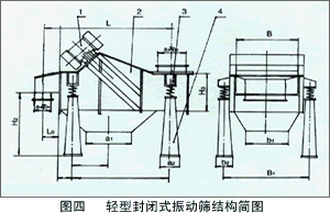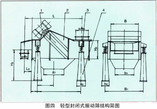 如:ZZS80.200/2F:篩面寬800mm、篩面長(zhǎng)2000mm;封閉式、二層直線振動(dòng)篩 ●選型說明:1、本系列輕型振動(dòng)篩的篩網(wǎng)通常為普通碳素編制網(wǎng)和碳鋼焊接網(wǎng),可根據(jù)用戶要求采用不銹鋼篩網(wǎng)。條縫網(wǎng)及其它特殊材料篩網(wǎng)。重型篩通常采用鑄鋼篩板,橡膠耐磨板和鉆孔篩板。 2、本系列振動(dòng)篩的產(chǎn)量均為處理量,及篩上物和篩下物之和,本系列的產(chǎn)品是以堆密度為1.6t/m3,給料中大于篩孔尺寸的粒級(jí)含量占25%,小于1/2篩孔尺寸的粒級(jí)占40%,篩面開孔為50%,篩孔為方型孔,篩分效率為90%的基礎(chǔ)上計(jì)算而來的,用戶在選型時(shí),只能以樣本中的產(chǎn)量為參考,并根據(jù)物料的具體特性(如堆比重、物料粒度含量、含水量、篩分效率、產(chǎn)量、篩網(wǎng)型式及網(wǎng)孔尺寸,并說明篩網(wǎng)層數(shù),結(jié)構(gòu)型式及結(jié)構(gòu)特征。 ●結(jié)構(gòu)說明:其結(jié)構(gòu)如圖三、圖四所示,主要由:1、振動(dòng)電機(jī)、2、篩體、3、減振彈簧、4、支腿等組成。 |